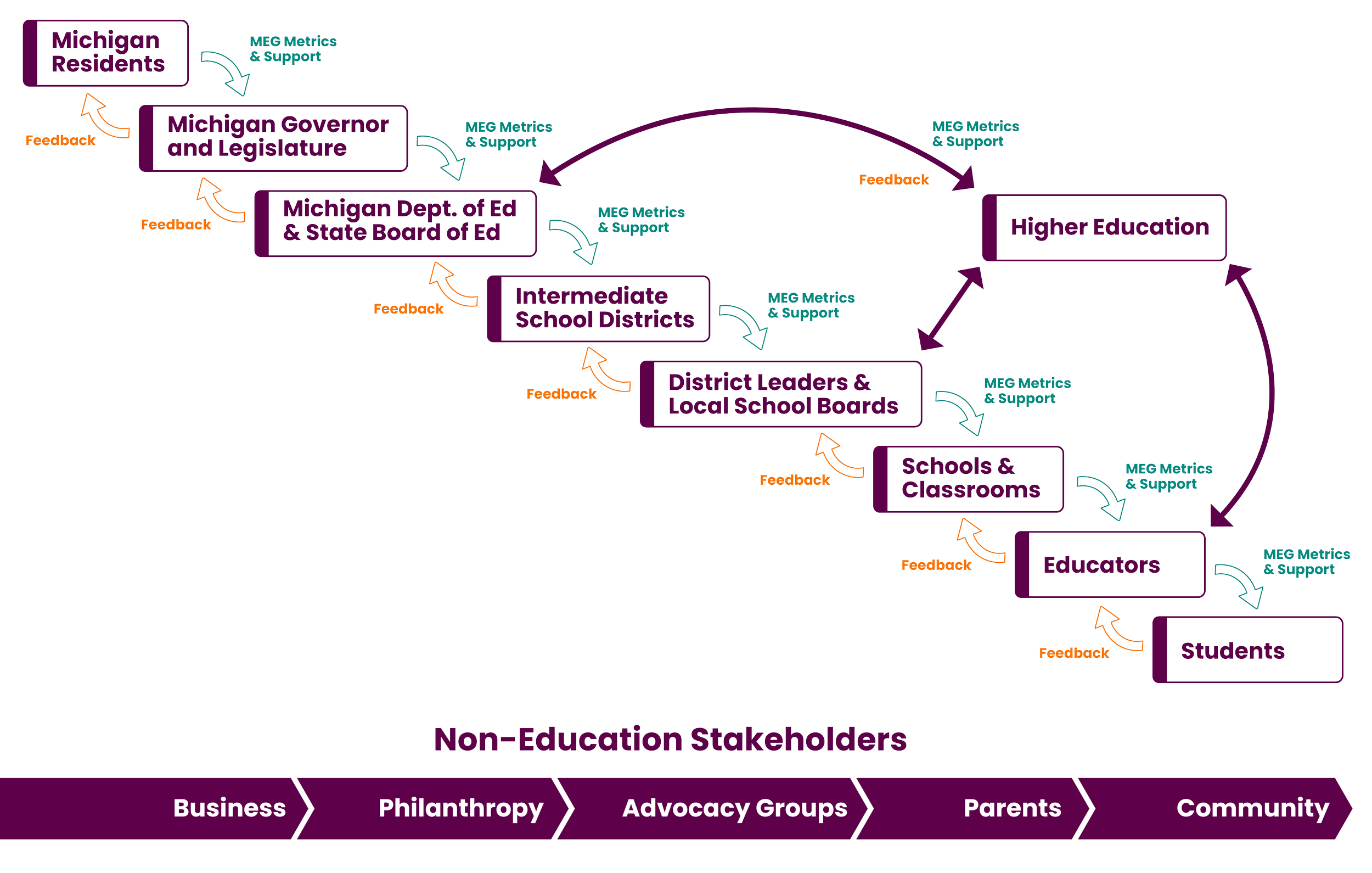 Students find fulfilling work, businesses gain skilled employees, and communities grow stronger. MEG aligns to a reciprocal accountability system where everyone - schools, families, businesses, and government - has both responsibilities and support. This interconnected approach to accountability builds a system that truly works for every student and creates the workforce Michigan's future demands.